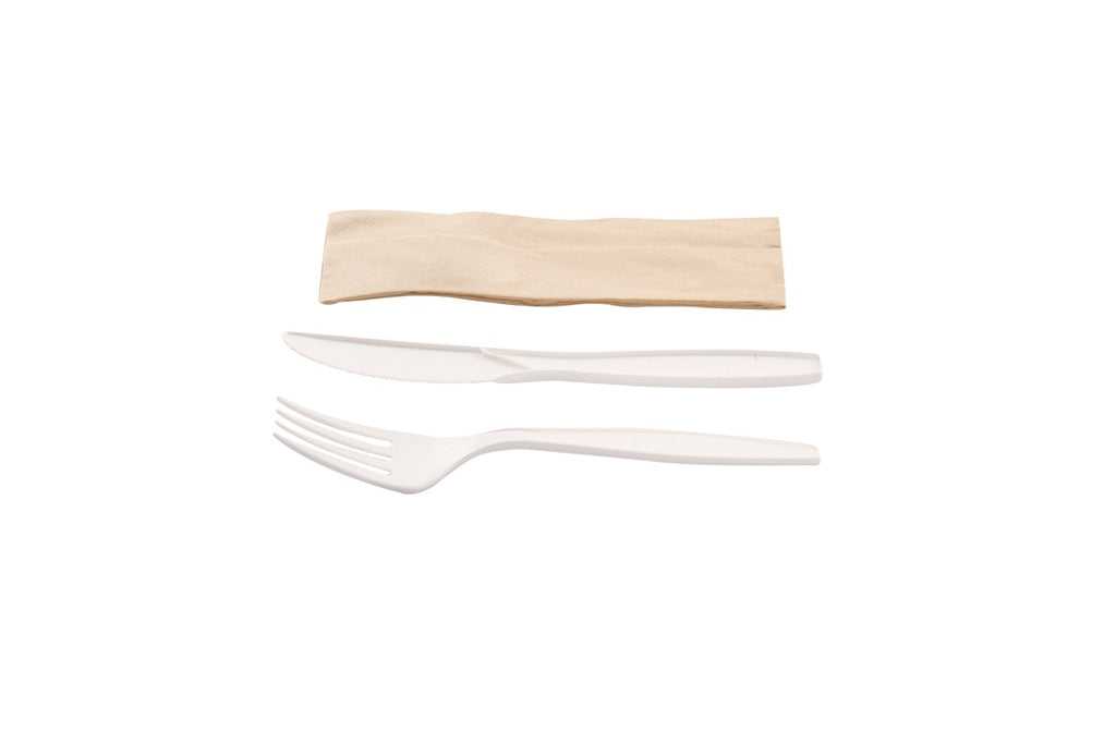 Kit couverts blanc 3 en 1 en maïs : couteau + fourchette + serviette kraft - 500 unités