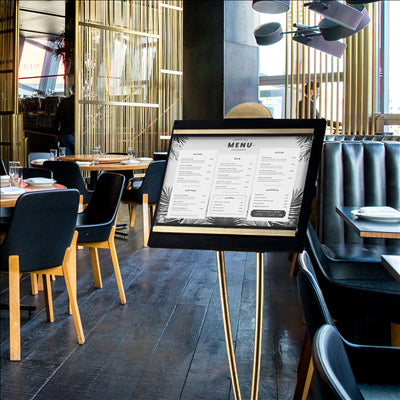 PORTE MENUS DIN-A3 AVEC PIED INCORPORÉ 46x38x135 CM NOIR/OR LAITON (1 UNITÉ)